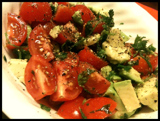 Avocado and Cherry Tomato Salad By Mj February 23, 2012 avocado cherry tomato salad Nothing is quite as refreshing as a quick and easy salad made with cherry tomatoes and avocados. Ingredients: Cherry tomatoes, avocados, fresh cilantro, cumin, fresh cracked pepper, garlic pepper, a squeeze of lime juice. Share this: Click to share on LinkedIn (Opens in new window) LinkedIn Click to share on Facebook (Opens in new window) Facebook Click to share on Pinterest (Opens in new window) Pinterest Click to email a link to a friend (Opens in new window) Email Click to share on Reddit (Opens in new window) Reddit Like Loading... Related