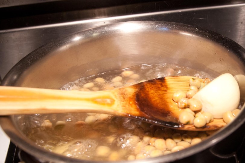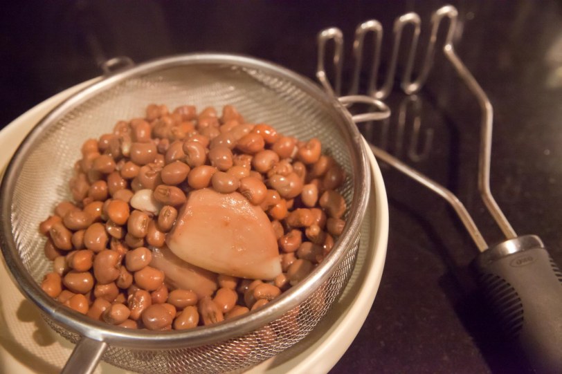 I placed the beans and about 6 GIANT garlic cloves in a pot of boiling water and a sprinkle of salt. I boiled them at medium heat for about half an hour, or until the GIANT garlic cloves had the texture of hard butter.
